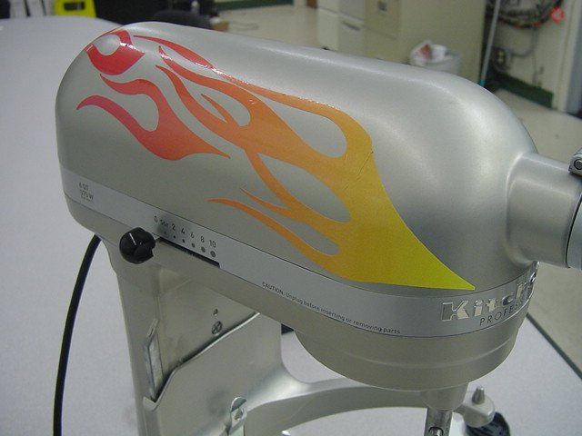 But let nobody say she's not a good person: yesterday she found for me a guy who makes flamejob decals... for home stand mixers like my Kitchenaid Artisan 600! A silver-and-black flamejob diamond-plate pattern flamejob decal is on its way to my home as we speak, to give my Kitchenaid mixer at least 100 more horsepower of pure high-grade awesome. My mixer, when done, will look very much like this (except awesome silver on awesome red):